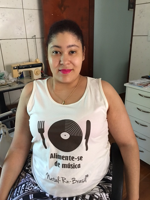 Claro que quando eu fui para Natal não fiquei o tempo inteiro no hotel,né?!Um dos lugares que eu conheci lá foi o Shopping do Artesanato Potiguar onde comprei,entre outras coisas,essa camiseta regata com esse “prato” em forma de vinil e a frase:”Alimente-se de Música”.Comprei para usar no dia-a-dia e já fui até trabalhar com ela: